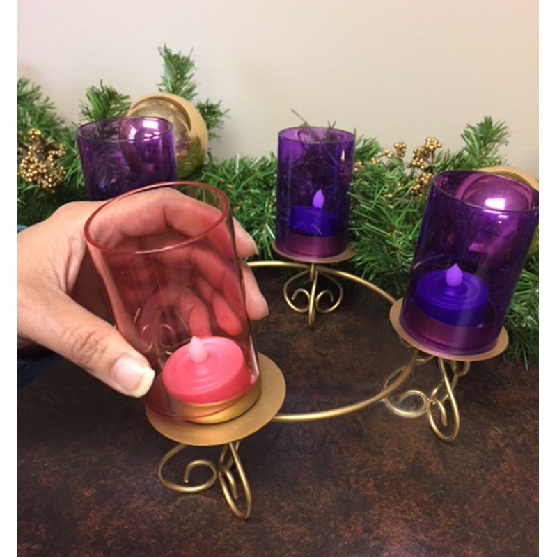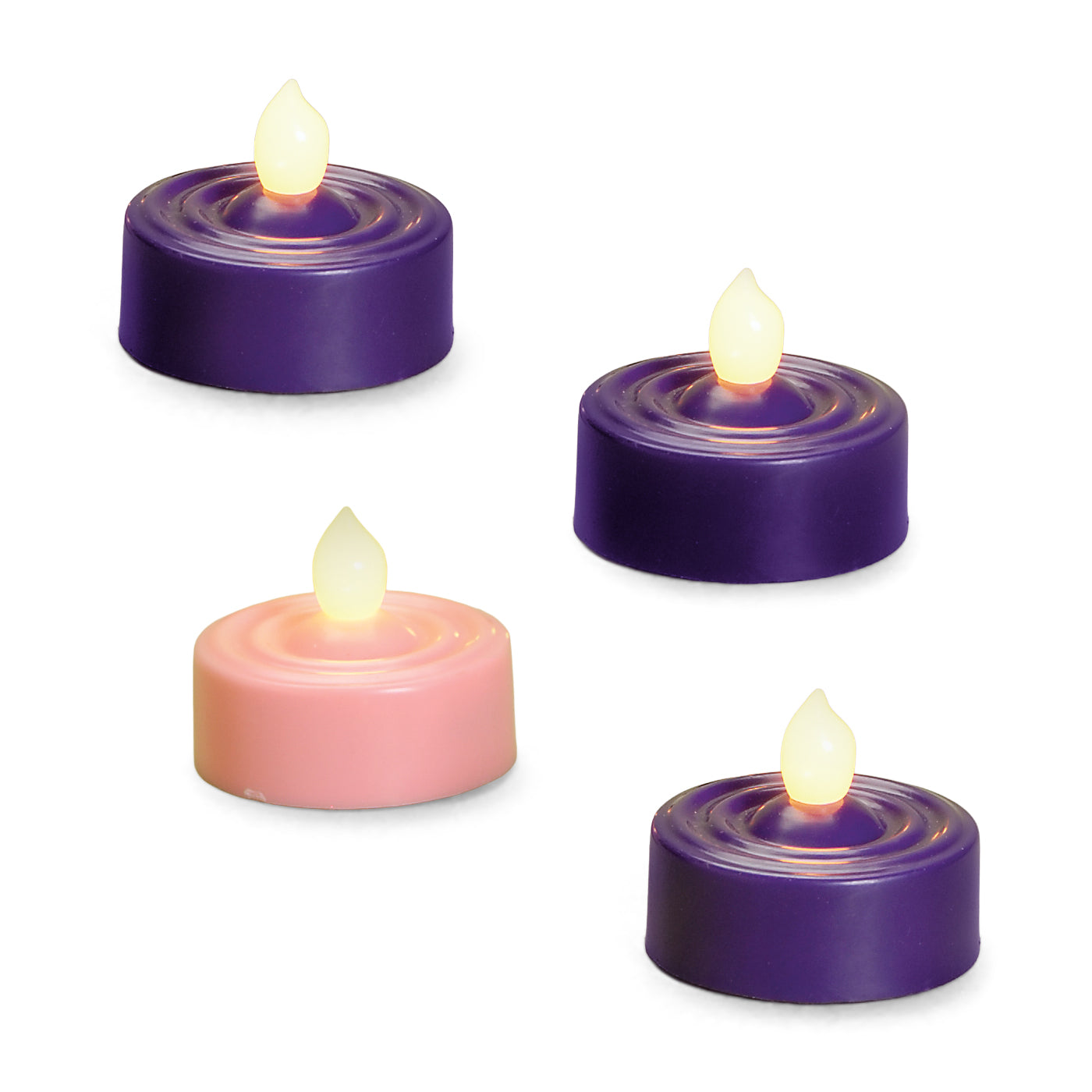 Do you need a safe alternative to tea light candles? This battery operated Advent set comes with 3 purple and 1 pink candle. They flicker gently, simulating a burning wax candle.
