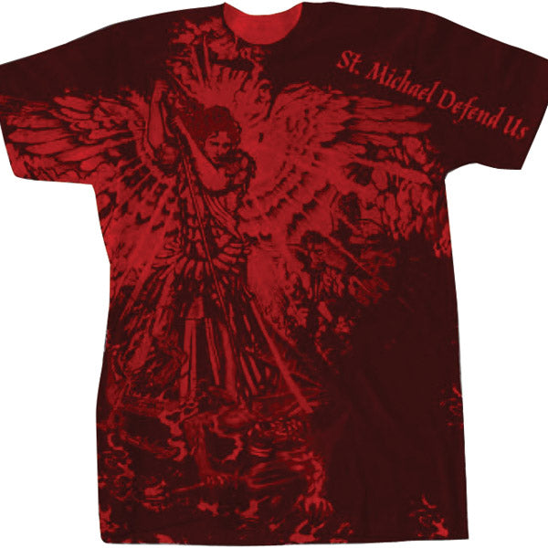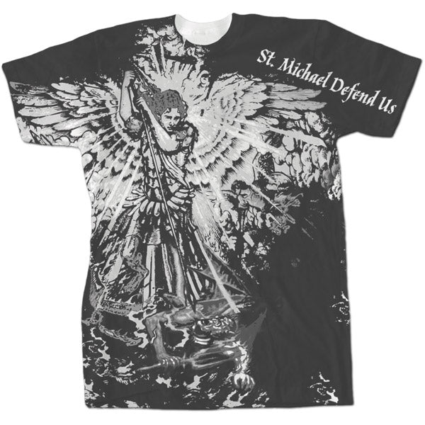 This stunning full-color* tee has a powerful image of the Archangel Saint Michael casting the Devil out of Heaven. A bold statement of faith!