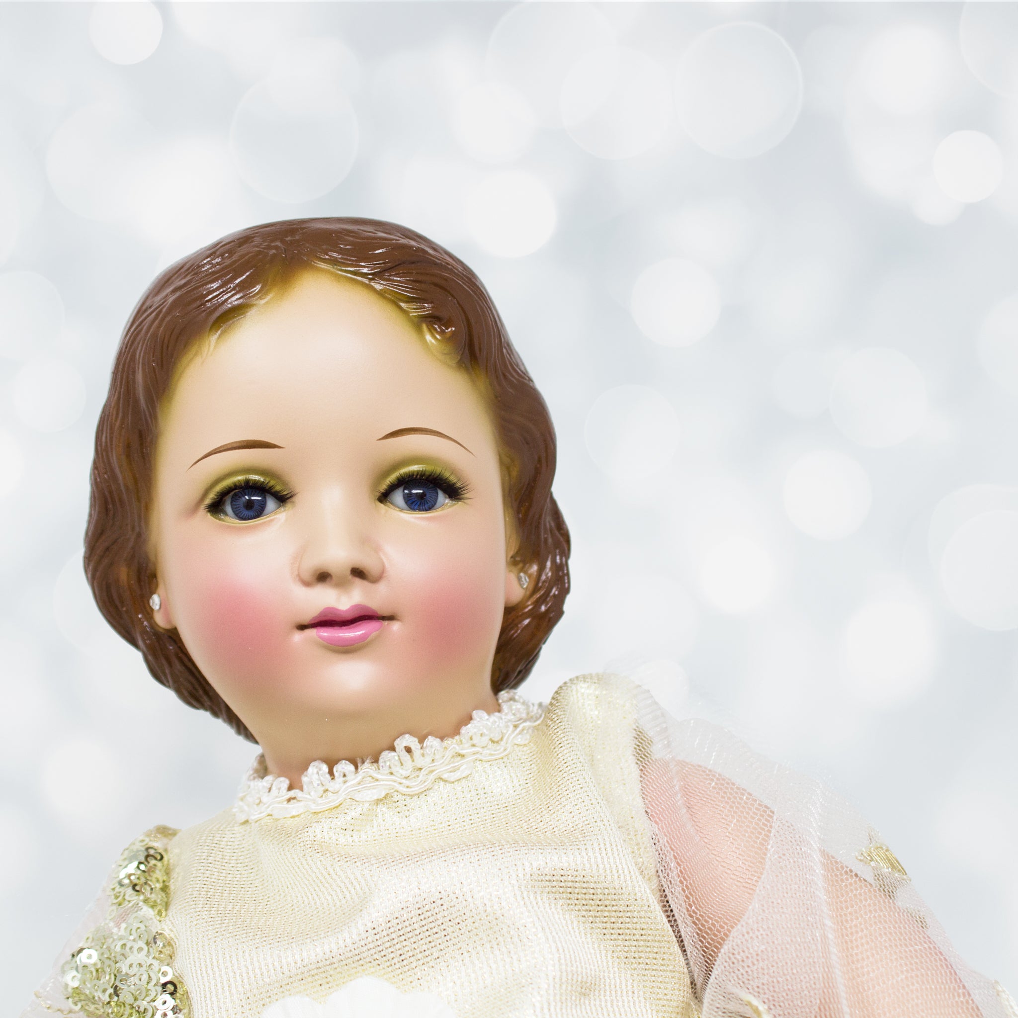 This incredible figure features Our Lady with gorgeous hand-painting, realistic glass eyes and a real cloth dress. Simply sweet from the top of her head to her little feet. In the year 1840, at a convent in Mexico City, the Virgin appeared as a baby girl dressed as a queen lying on soft clouds. The infant queen said, "I will grant all the graces to the people who honor me in my childhood because it is a very forgotten devotion." Her feast day is celebrated on September 8th, the birthday of the Blessed Virgin Mary.