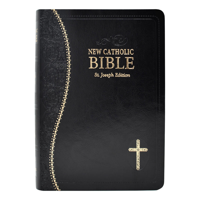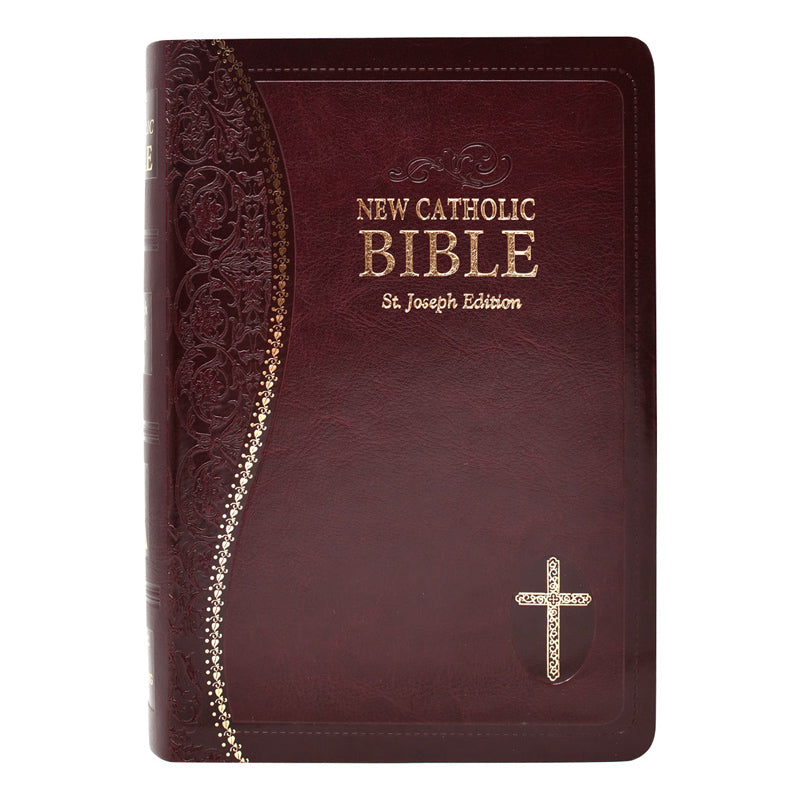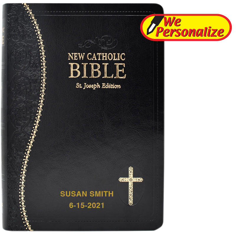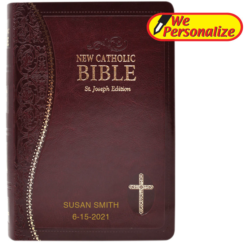 This Catholic bible features words of Christ in Red, beautiful illustrations, a family record section, maps, a doctrinal bible index, a liturgical index of Sunday readings, a handy bible dictionary, the Vatican II constitution on Divine Revelation and all footnotes and cross references keyed in text. Beautiful soft, faux leather with gilded pages, you can have one plain or have it personalized for an extra special touch.