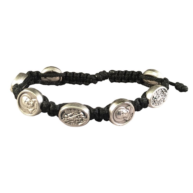 Adjustable macrame bracelet which includes Padre Pio, St Michael and Guardian Angel medals.