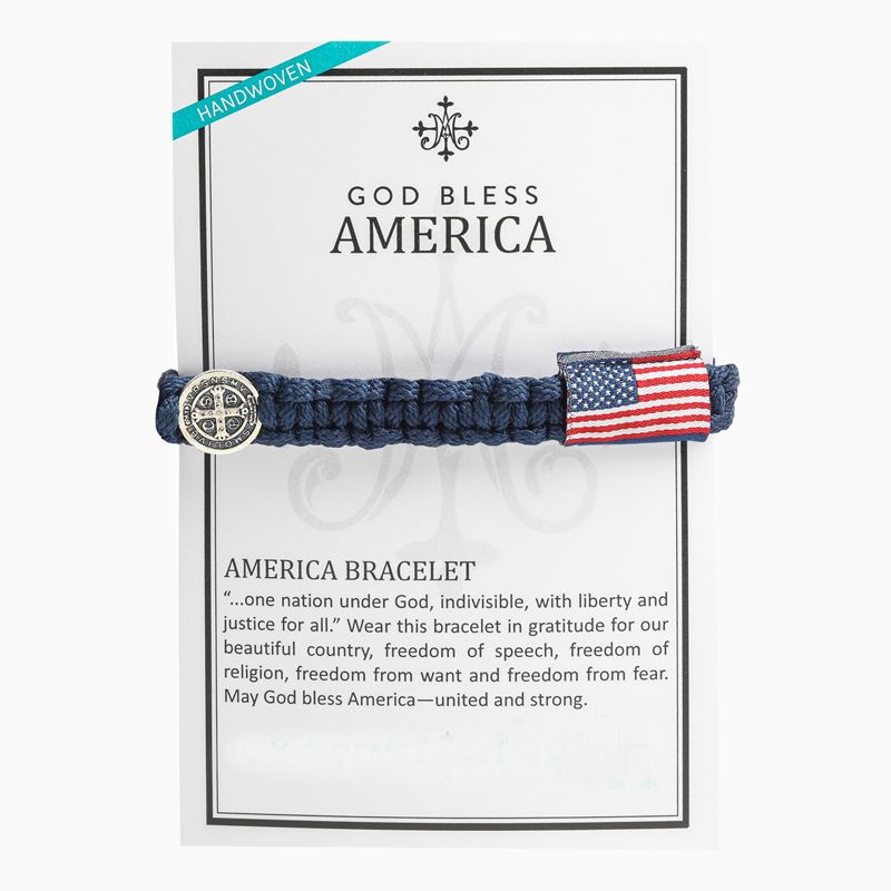 Card reads: "...one nation under God, indivisible, with liberty and justice for all." Wear this bracelet in gratitude for our beautiful country, freedom of speech, freedom of religion, freedom to dream, and freedom from fear. May God bless America - united and strong.