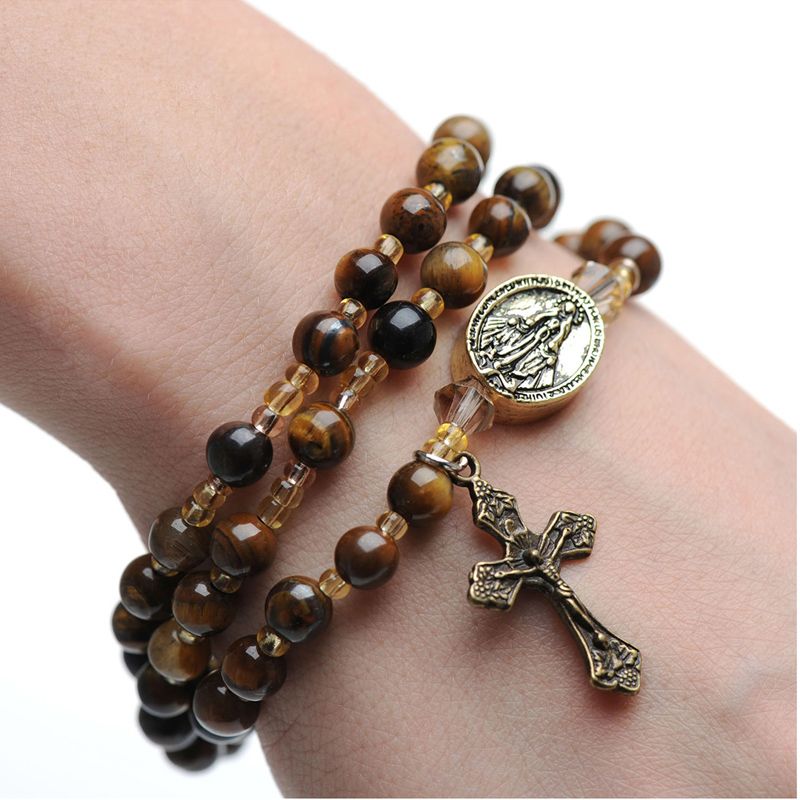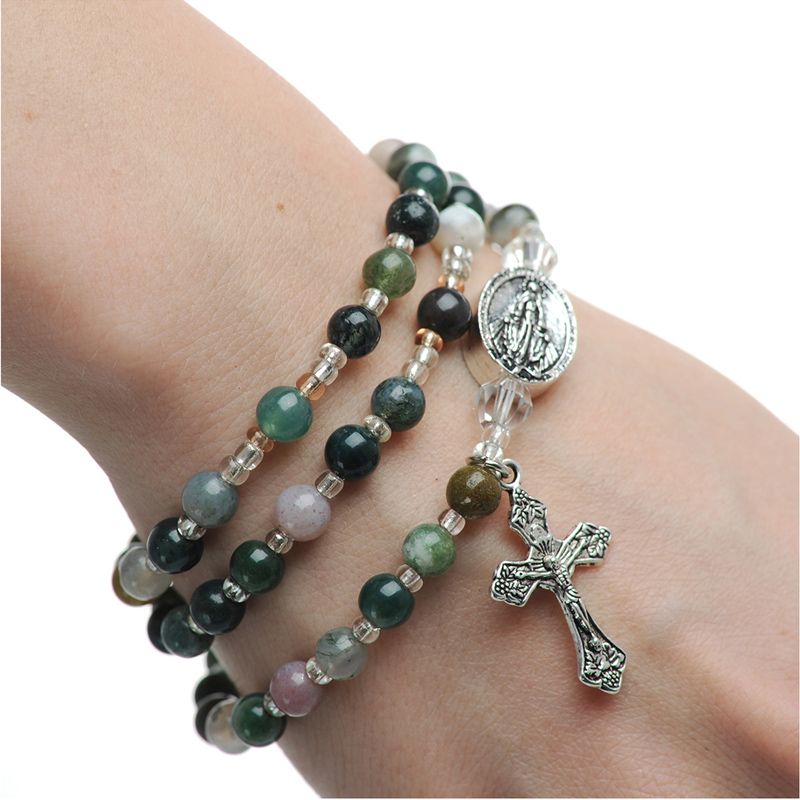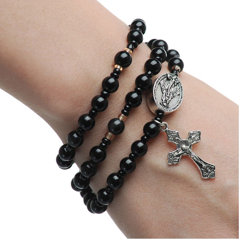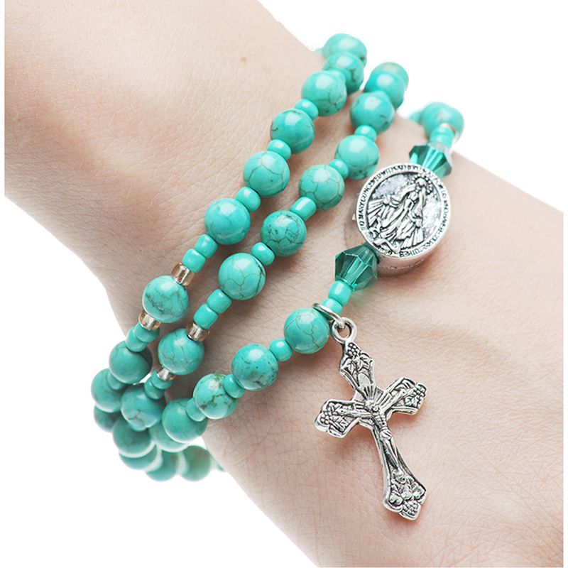 These beautiful, simulated gemstones coil about the wrist with just the right amount of stretch so that it's secure, and yet a good fit for everyone. Uncoil the beads, and you have a full Catholic rosary, ready to say your daily devotion.