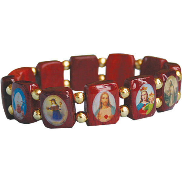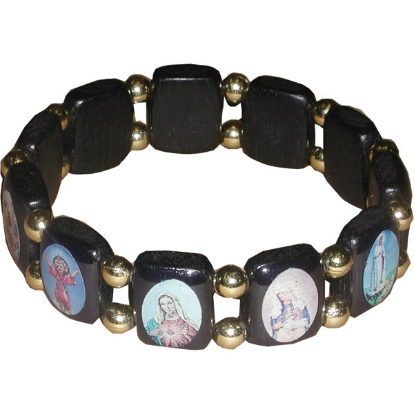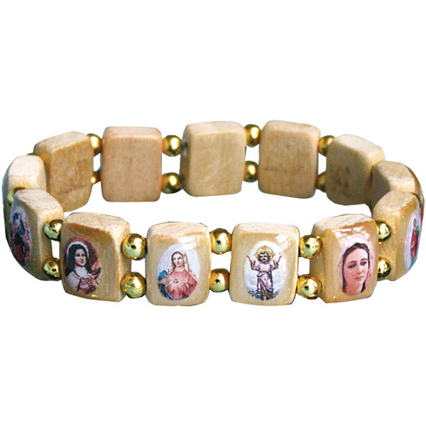 Elastic band with variety of holy images These simple wooden bracelets are perfect for children's gifts to help teach the faith, or just to have as a daily reminder of the power and presence of the Saints!