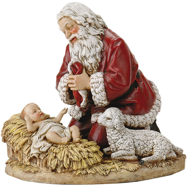 This lovely image captures the essence of Christmas with the Lord Jesus, the true reason for the season, being adored by the modern image of Santa Claus. A humble lamb is seated next to Santa. Beautiful hand painted resin figure. Boxed.
