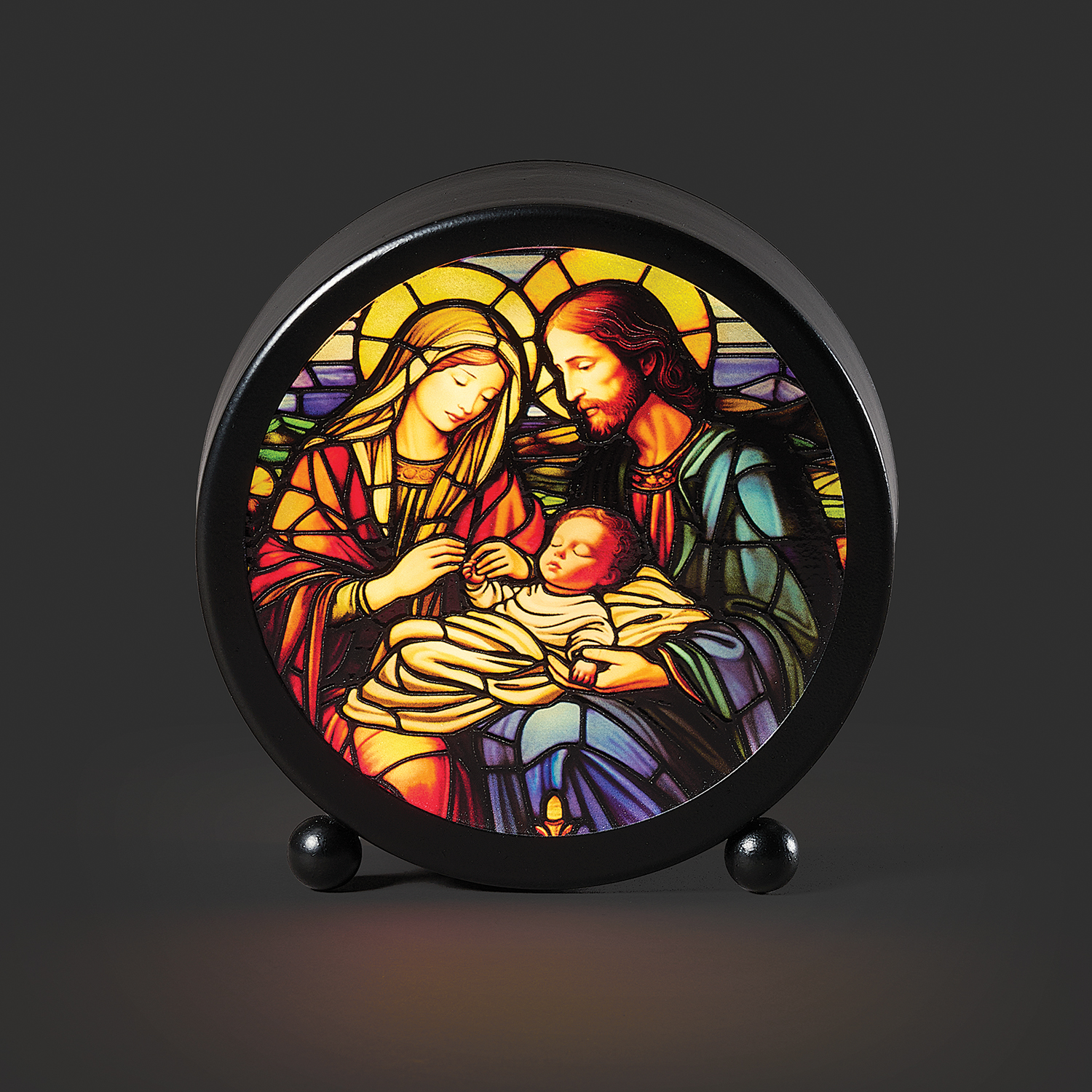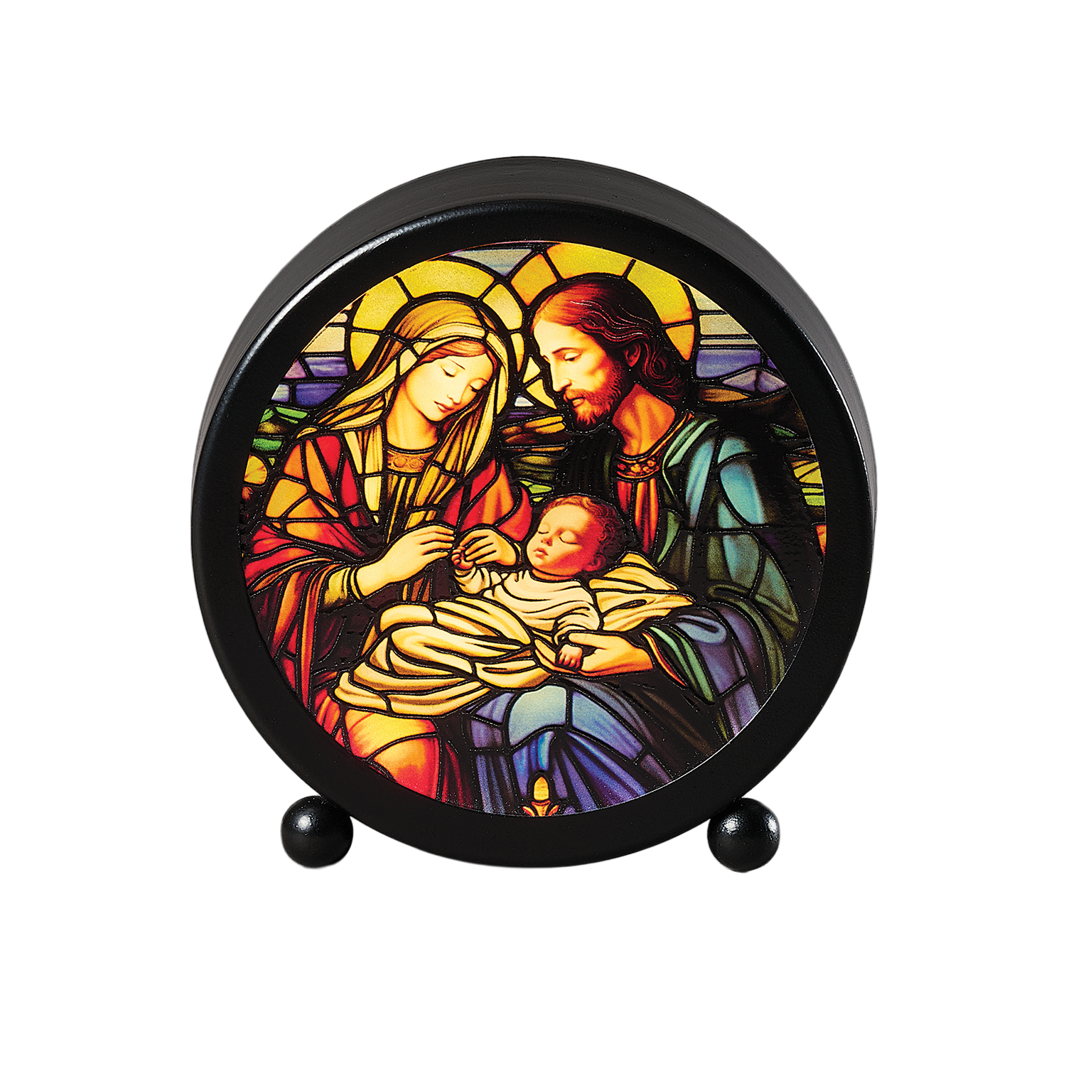 This beautiful piece stands at 4.5" tall, reflecting a beautiful image of the Holy Family. Mary and Joseph are holding a sleeping baby Jesus. Crafted from Glass and metal, this lighted piece is powered by 3 AAA batteries. *Batteries not included.