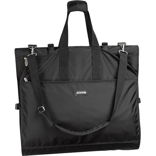 Holds up to 6 garments. Lined interior with plenty of pockets and room for shoes, accessories and other essentials. Handles fasten together with velcro for easy carrying. Shoulder strap. Padded roll bars secure clothing and prevent wrinkles and side release buckles hold bag together when folded.