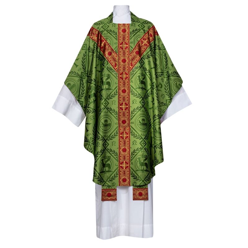 Now available for the first time in over a century, this gorgeous vestment features traditional symbolism like the Chi-Rho, Fish, Loaves, and the Lamb. Making it a great piece for Christmas, Easter, Funerals and Benediction celebrations.