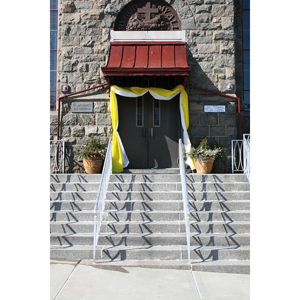 After a new Pope has been elected, churches are encouraged to place a white and gold bunting around the exterior doors of the church.