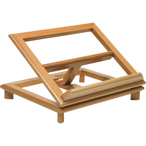 Large - 14"L x 12"W x 4"HT Cut-out style frame with approx. 1.25" legs. Hinged top piece with lower lip (to hold the book). Angle the text with a wooden tab to set in one of three places, depending on how tilted you need the book. Finished wood for a smooth feel. When open and on the highest tab setting, it's about 7" in height.* *May vary depending on the size of the stand.