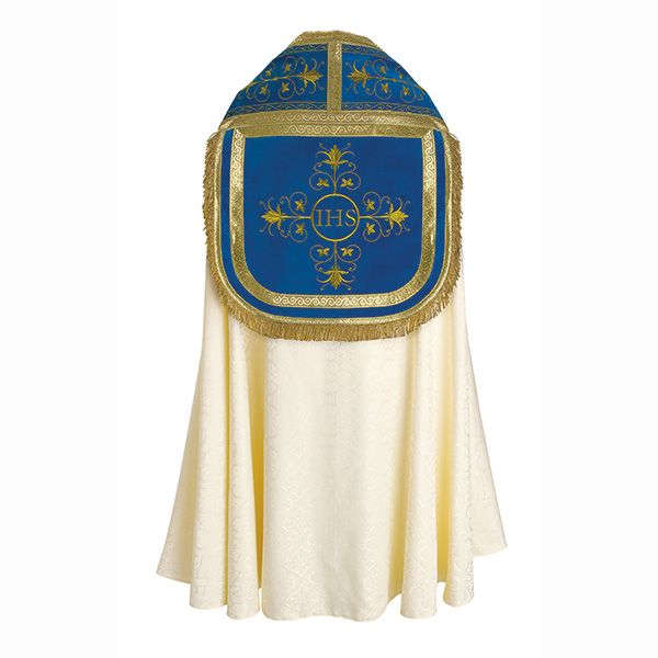 58" Back length Beautiful embroidery, front and back, on royal blue velvet. Machine embroidered. Celebrate the grand processions of the Catholic religion with this glorious Roman Cope with Marian theme.