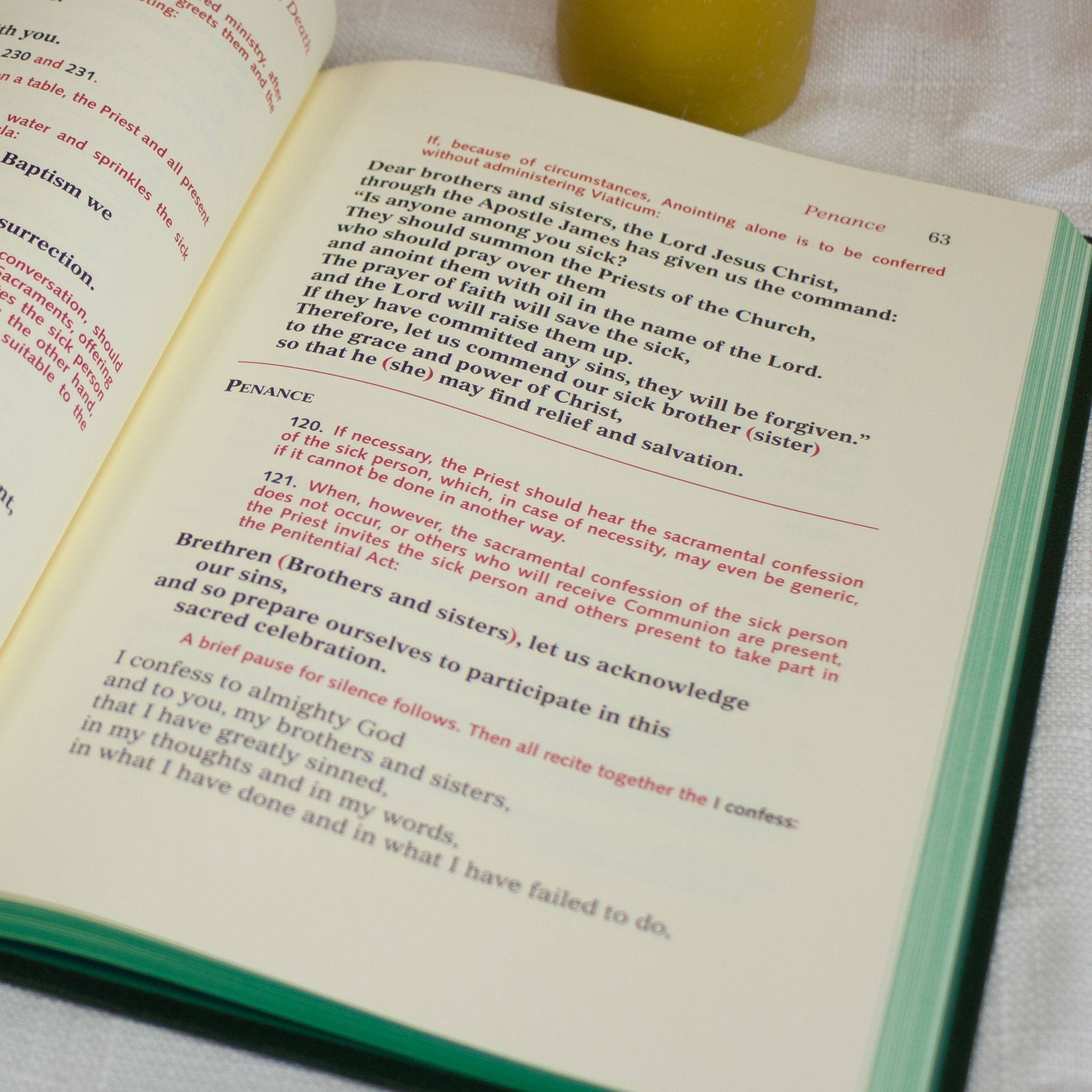 This is the official, revised edition of The Order of the Anointing of the Sick and of Their Pastoral Care, which includes all the enhanced features that celebrants have come to know and trust from Catholic Book Publishing: large, easy-to-read type, printed in two colors; a proven layout that respects functional page-turns, deluxe end-papers; a sturdy cover, and two satin ribbon markers to add an elegant finishing touch. Specially produced acid-neutral cream paper from established, quality mills ensures a high level of opacity and consistency of the highest degree. 240 pages. Size 71/4 x 101/4.