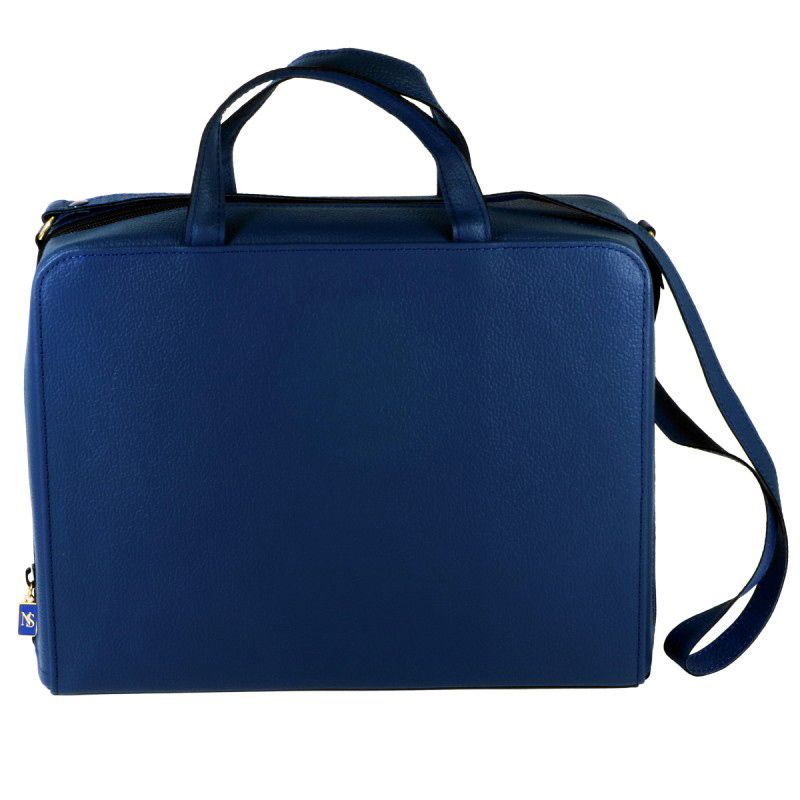 Genuine blue leather with shoulder strap and handle, zippered closure.
