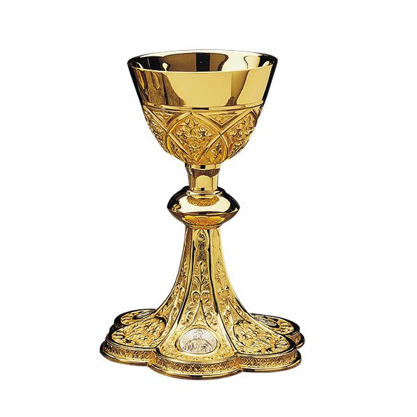 This stunning piece of fine metalwork is perfect for offering the sacred mysteries of the holy faith. Highly ornate and polished, you have your choice of gold plated brass, or you can have the inner cup done in sterling silver with gold plate.