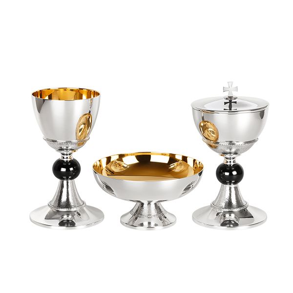 Delicate hand hammered texture with light oxidized finish. Black acrylic node. This stunning set of fine Catholic vessels are both traditional and simple, like the Holy Father and his focus on simplicity while also embracing tradition. Crafted in the style of the masters and finished with a rich silver plating, this open ciboria will last a lifetime.