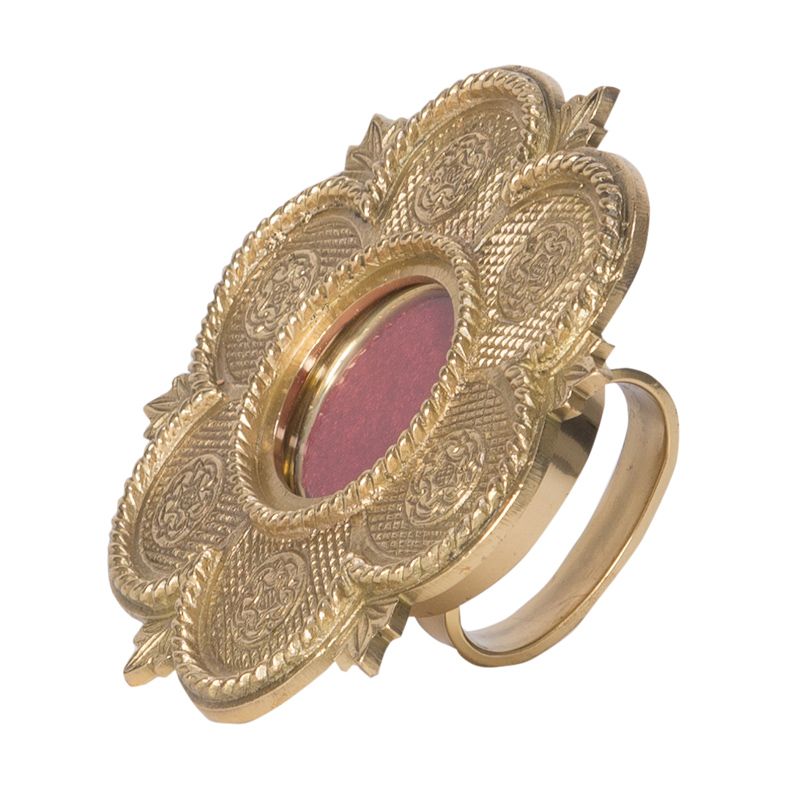 This handsome piece is made of solid brass and features a handle to hold the vessel when the relic is presented for veneration, and a viewing glass at the center surrounded by a ornate rounded lobes.