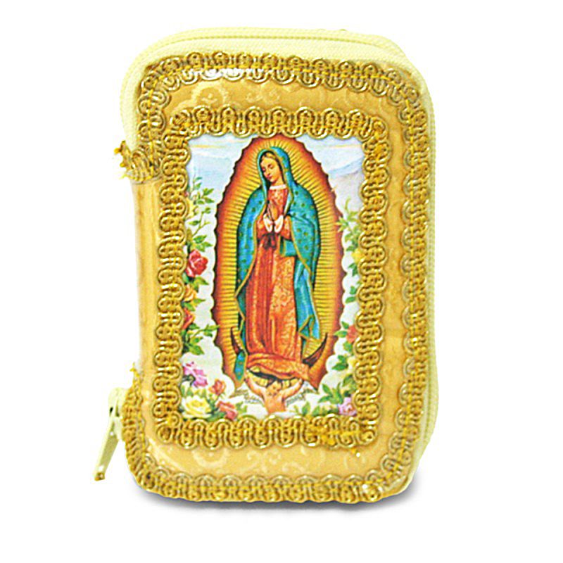 Vinyl image of Mary on one side, Secure zipper with tassel.