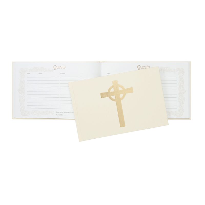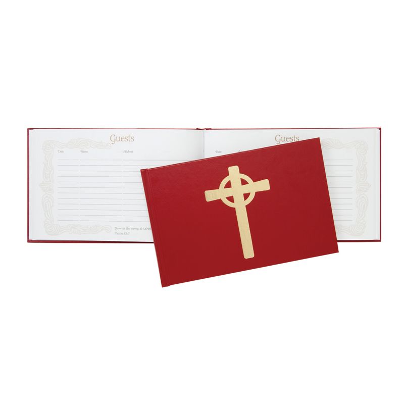 "I will praise thee with my whole heart." - Psalm 138.1 Simple, clean pages fill this sturdy guest book with gold cross on the front of the hardcover. Available in your choice of red or white