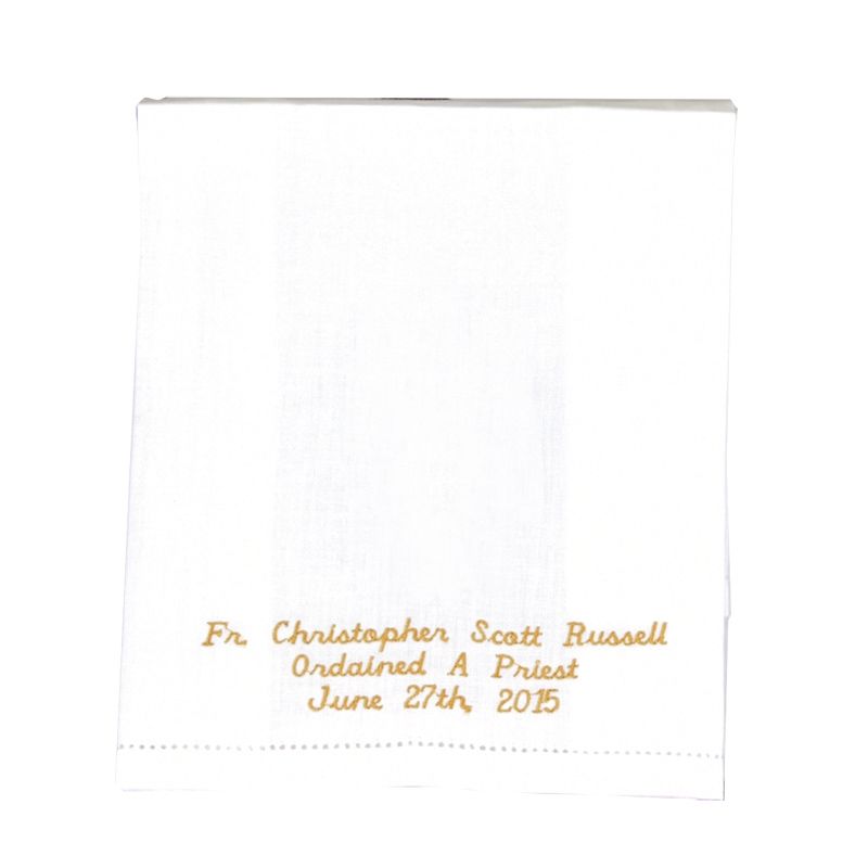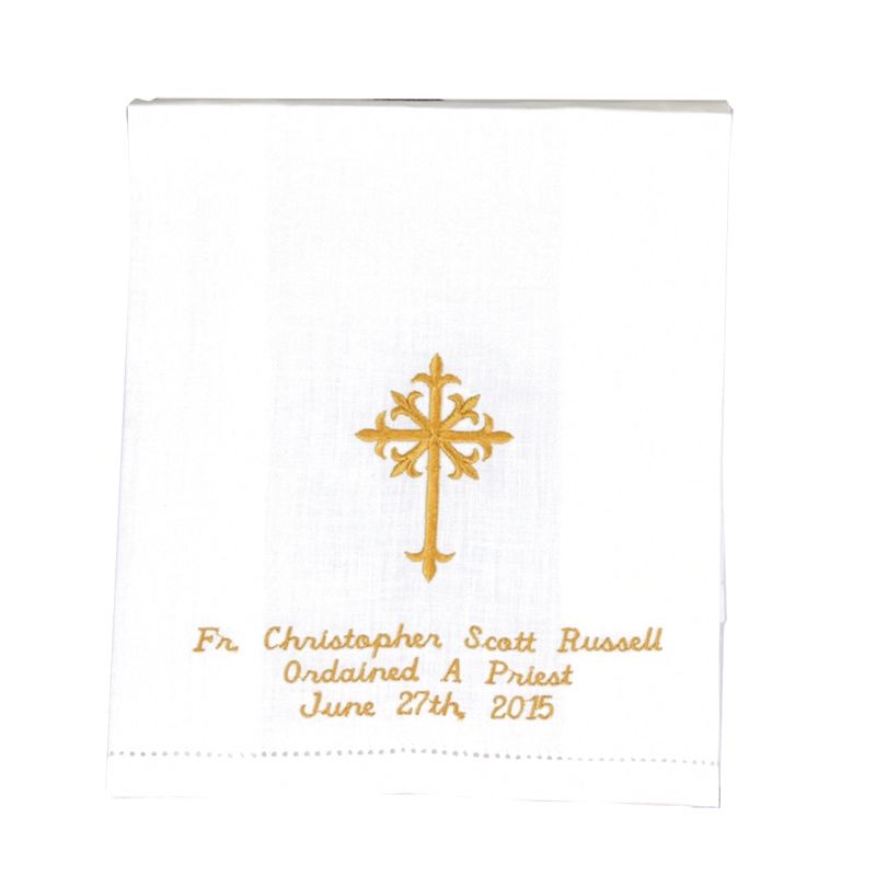 Made of 100% pure linen, hem-stitched and with gold embroidery, this handsome maniturgium is a traditional way to honor the holy day of Ordination into the priesthood of Jesus Christ.
