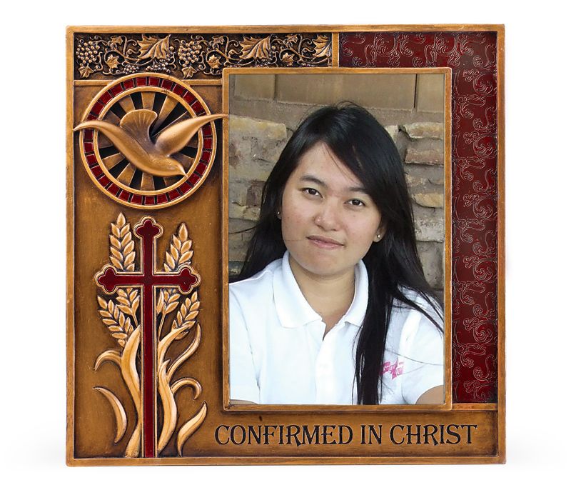 This beautiful Catholic frame features a bronze-like tone with rich red details to highlight the descending dove over the cross and scroll-work on the right side. Holds a 4x6" photo to remember that most special day of Confirmation.