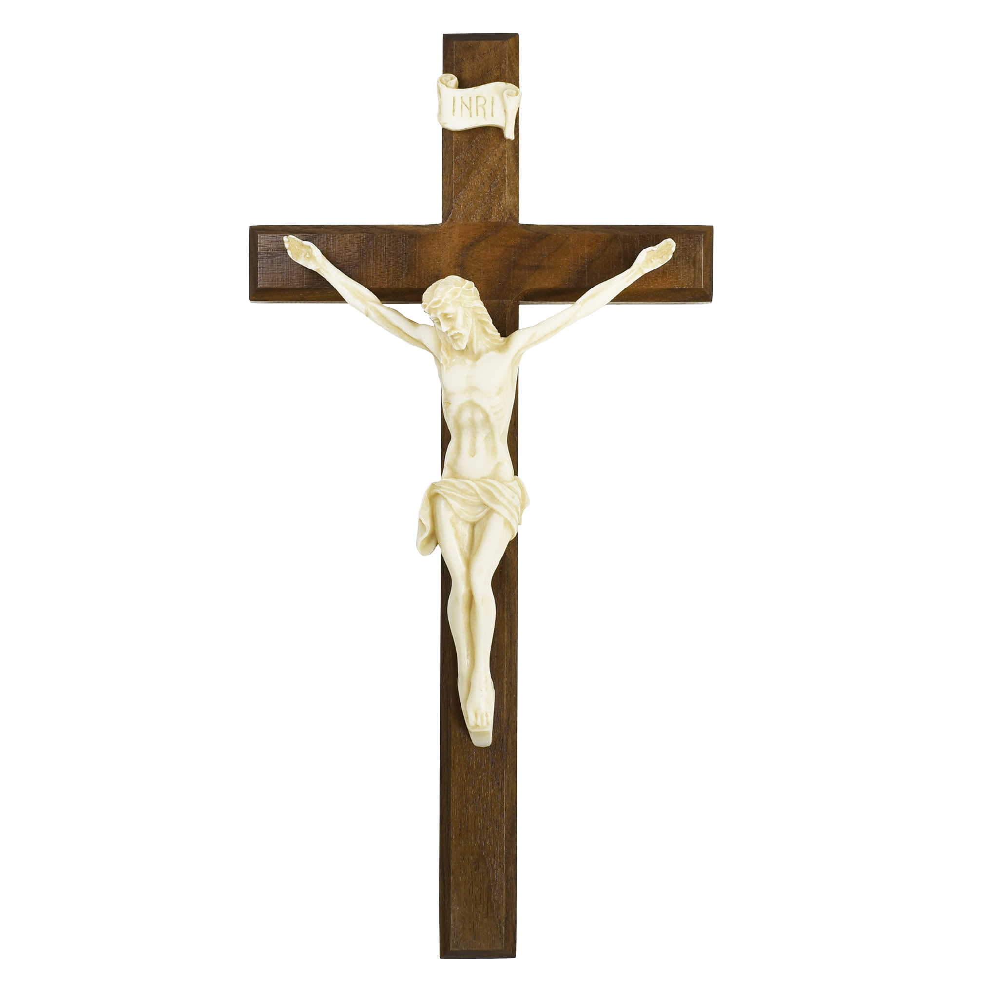 The Crucifix displays the core, fundamental truth of Catholicism. Our Lord, Jesus Christ, suffered and died for us. Every Catholic home needs a beautiful crucifix. Traditionally, crucifixes are placed above doorframes and beds in homes. In places of worship or home altars, they should be more prominently displayed. Missing a wall crucifix in your sacristy or home altar? Browse our collection of expertly crafted, beautifully painted crosses and crucifixes. Our crucifixes come in many different sizes (ranging from 4" to 38"), styles, and materials (including resin, wood, plaster and metal).