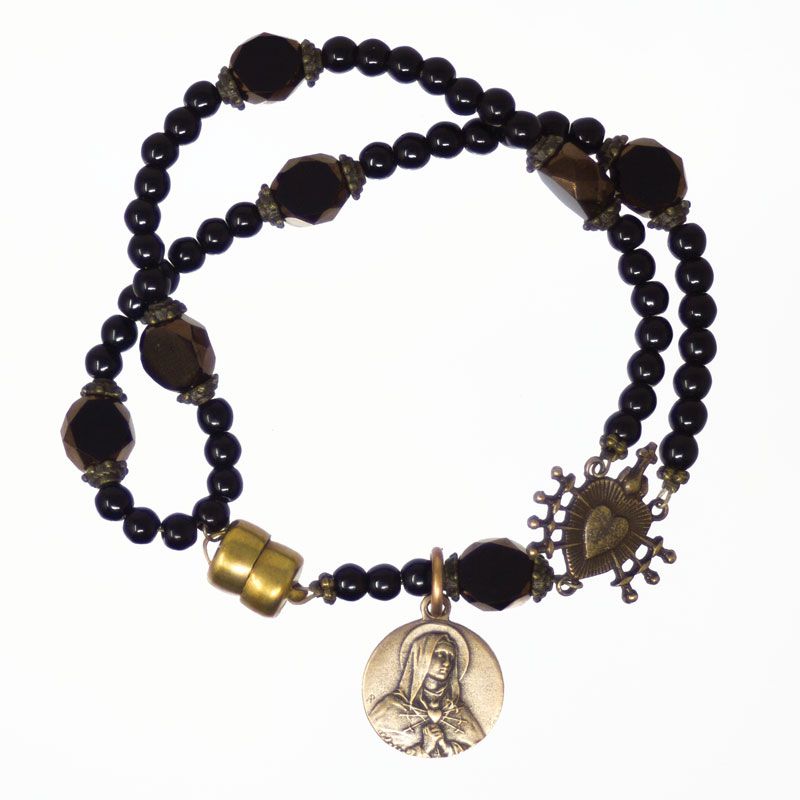 This gorgeous piece features the Chaplet of the Seven Dolors when unclasped, dedicated to Our Lady of Sorrows. Lovely Immaculate Heart pierced with swords, and a medallion with the Crucifix.
