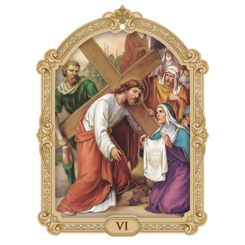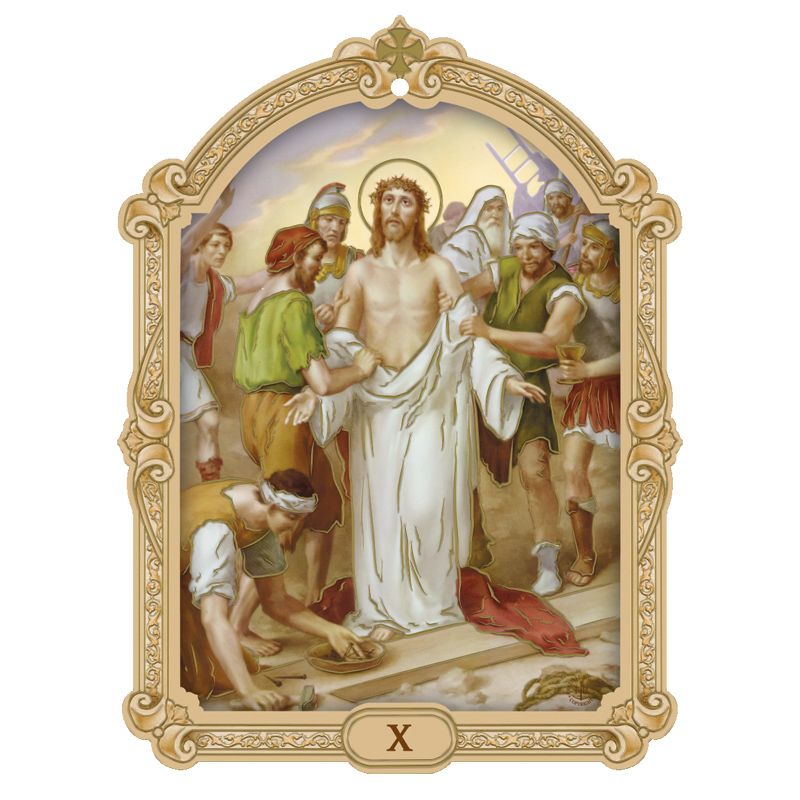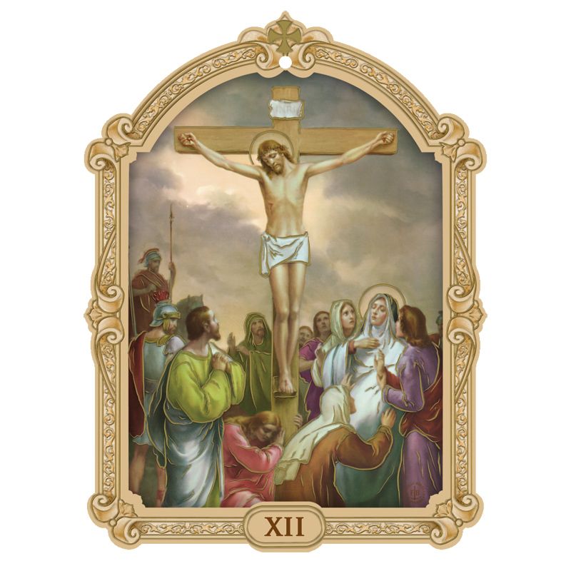 These lovely images are personal sized for praying the holy Way of the Cross. Each one has a small hole if you wish to hang it up. Or, they're small enough and slim enough to tuck into vinyl case like you might use for prayer cards so you can take them with you. Hardwood material with gold stamping.