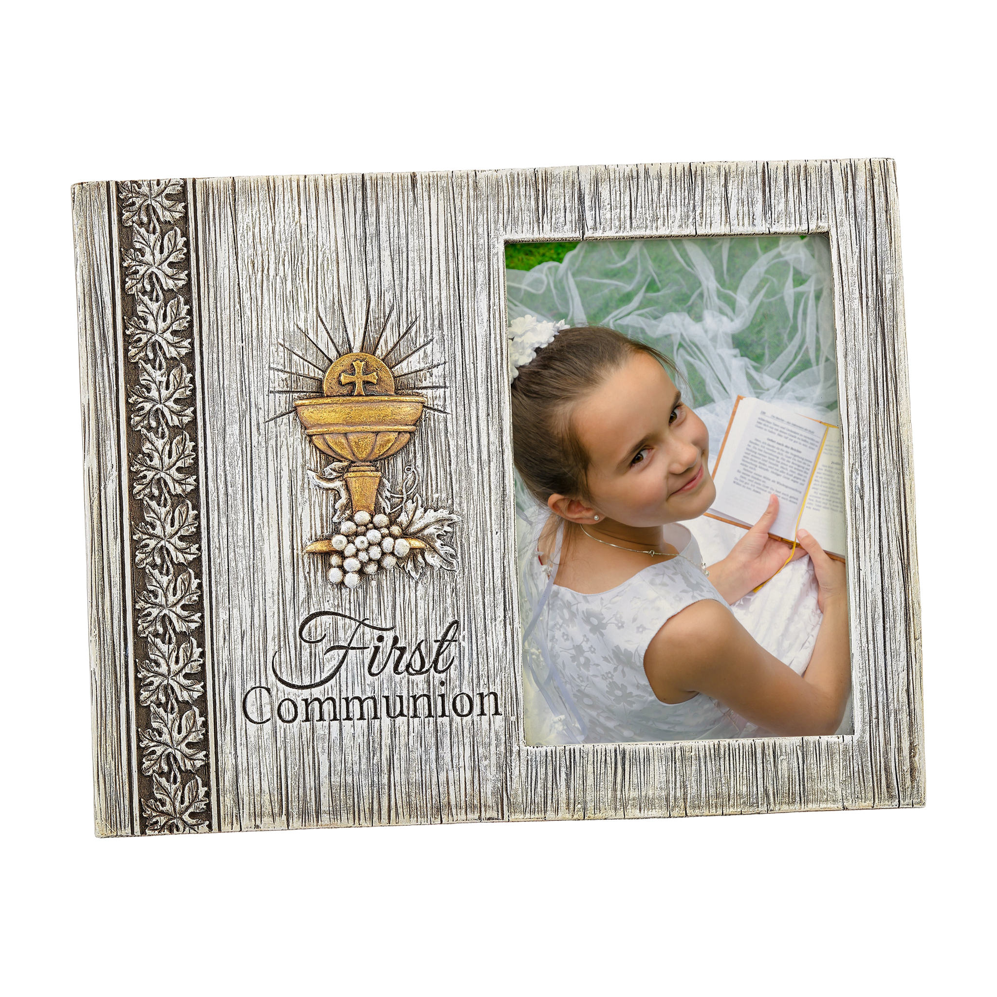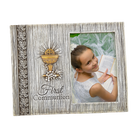 Keep your best photo from that special Eucharistic day in this gorgeous frame with a white, wood-like style and distressed, gold Chalice/Host, and grapes symbol in the corner. Reads: First Communion along the top.