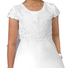 Lacy Overlay bodice with pearl accents and simple sleeve stylize this organza A-Line. Ties at center back, dress is totally lined.