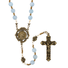 Stunning 8mm blue jade bead rosary with beautiful bronze accents to showcase Our Lady of Lourdes. The way the details of this Catholic rosary flows reminds us of Mary's healing promises given to St. Bernadette.
