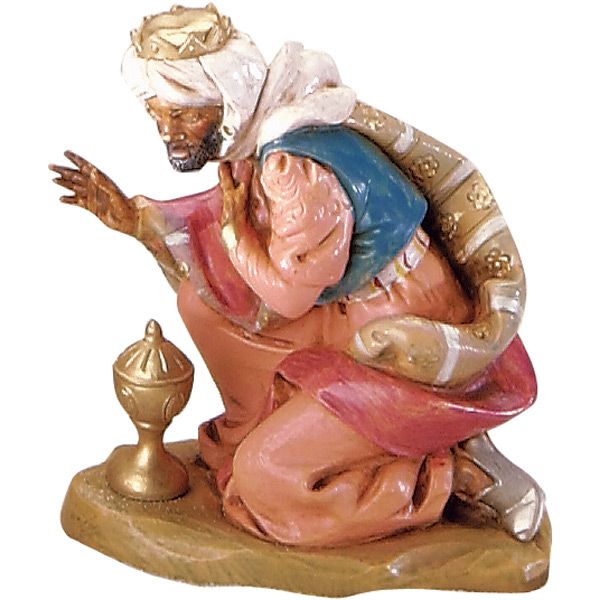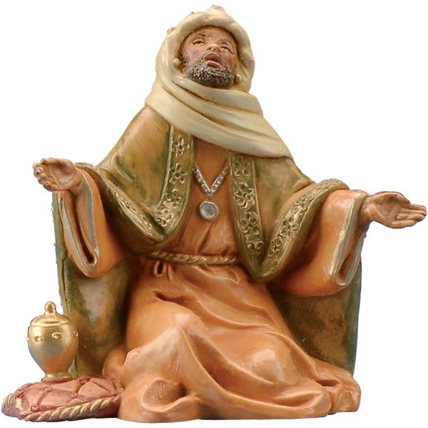 Prince of Africa and King of Saba, Balthazar brought Myrrh to the Christ Child. He died at the age of 112 on the Feast of the Epiphany, just days after seeing the Christ Child. He is dressed in a coral tunic with a deep coral robe, down on his knees with a gold container of Myrrh standing before him in this Fontanini king figure made of unbreakable, child friendly polymer. Introduced in 1995, King Balthazar is a part of the Fontanini Heirloom Collection.