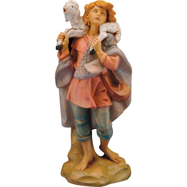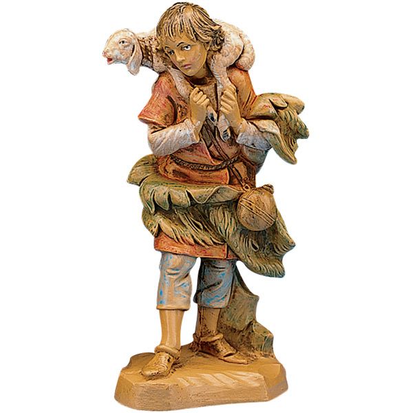 Gabriel's kindness to animals makes him a shepherd your set of Fontanini figures should have. Though most of the time he finds himself daydreaming, he's always the first person in the village ready to help troubled animals. He is depicted wearing a light orange tunic looking up as if thinking of something, carrying sheep on his shoulders in this skillfully sculptured shepherd figurine made of tough polymer.
