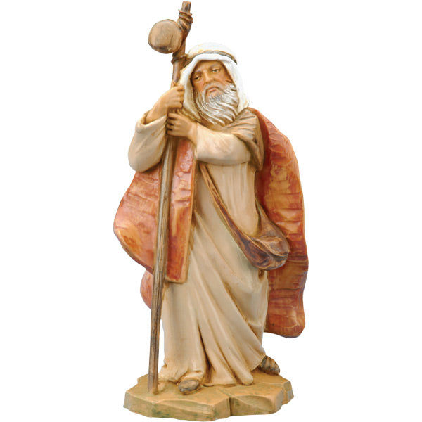 Include an old and wise man to your collection of 5 inch Fontanini shepherd figures. Isaiah was known by other villagers as a slow walking, gray bearded old man. He is represented walking with a long staff, equipped with a water bladder, and wearing a long homespun robe with folded orange cloak and brownish leather pouch in this finely sculpted Shepherd figurine colored with non-toxic paints.