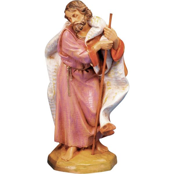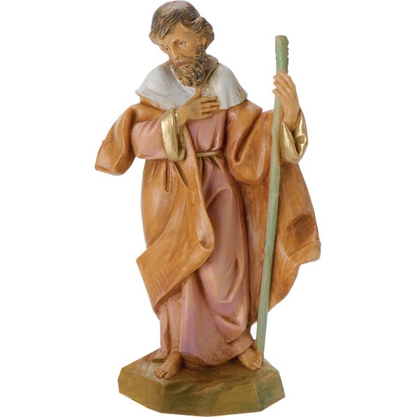 Joseph is standing, leaning slightly on a staff he is holding with both hands in this figure. He is captured gazing directly downward toward the new born King Jesus Christ. He's dressed in a long, belted tunic and a fleece-lined robe. It's a complementary piece to the Holy Family in Fontanini Heirloom Collection.