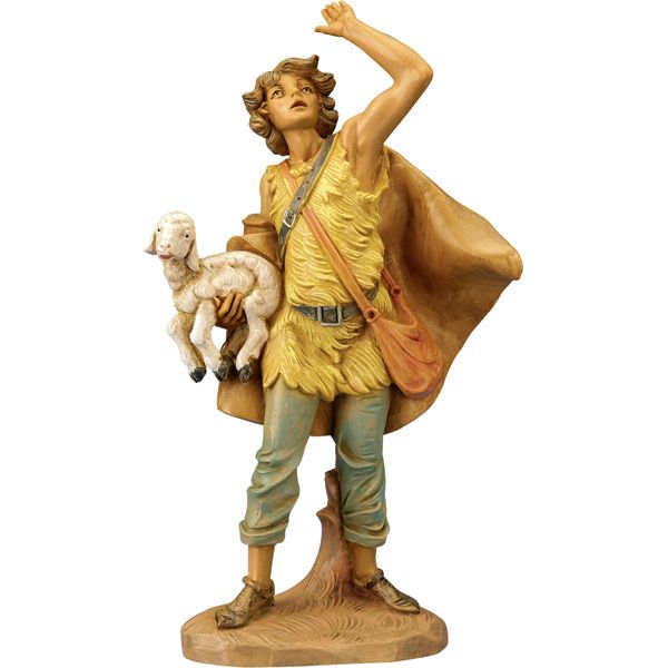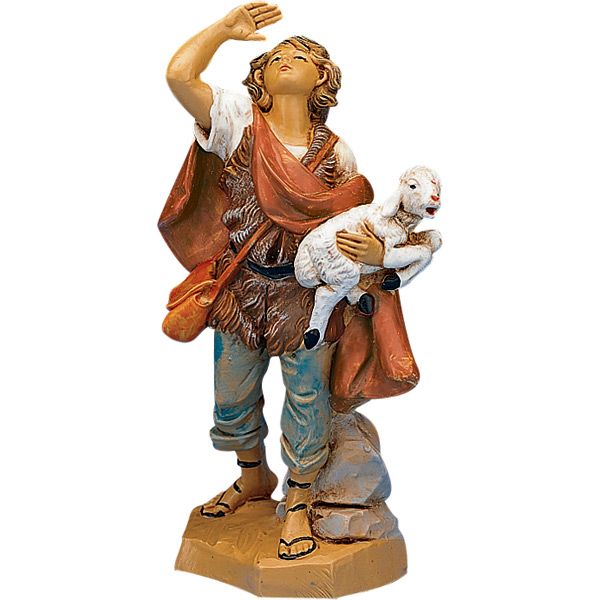 Micah is one of the Shepherds watching the flocks by night. While petting his lamb one night, he observes a bright star at the sky. He is depicted wearing a furry tunic with cloak, holding a lamb in his right arm, staring up inquisitive of what the brightly shining star brings in this charming boy Shepherd figurine made of tough polymer. Like other villagers who had seen the radiant star, Micah surely has his own story to tell, making this figurine a wonderful addition to your Fontanini Nativity figures.