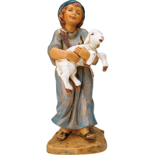 Include the young Shepherd Silas to your selection of Fontanini 5 inch scale Villager figures. Silas is known by the villagers as the charming little boy who always finds himself carrying his baby lamb around. In this cute little Shepherd figurine, Silas is represented wearing a light blue robe, carrying his lamb with both hands in a radiant, happy gesture. He`s a charming addition to any 5 inch scale figurines collection.