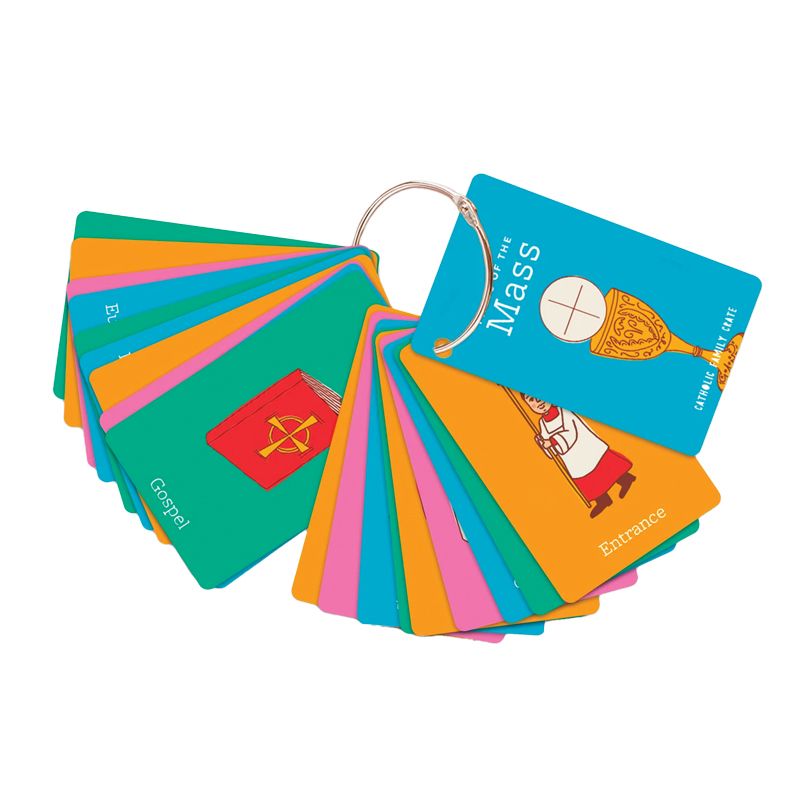 Now little hands can be handling these durable cards to keep them engaged during the Holy Sacrifice. Color-coded cards help pint-sized Saints discover the four parts of the Mass rite.