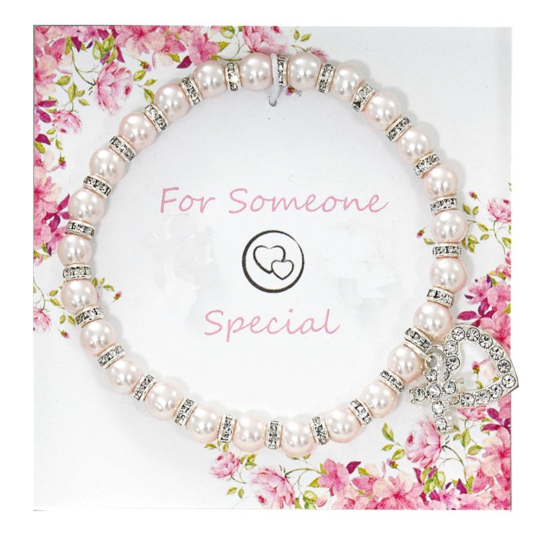 Remember someone special with this stretch style bracelet featuring the holy Cross paired with the universal symbol of Love, a Heart.