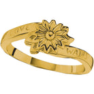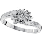 Flower center with the words "Love Waits" (Love is on top of band, Waits on bottom, on either side of flower.) Smooth band, open behind flower not solid.