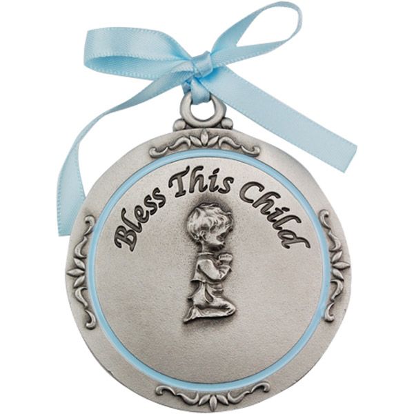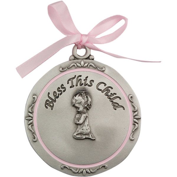 Bring the gift of faith to a child's room with the Bless This Child Crib Medal with either blue or pink ribbon. Features a child kneeling in the center with the verse arched above. Makes a great new baby gift! And have blessed to add divine protection.