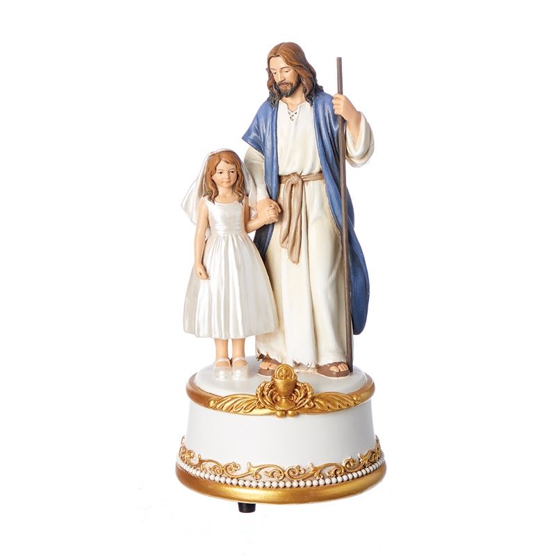 These beautiful figures features our Lord Jesus with your choice of a boy or girl dressed in their First Communion best. Has beautiful gold color trim on the base, with chalice and host symbolism. A lovely keepsake of that most special day of receiving First Eucharist. Pieces measure 7.5 inches high and are 3.5 wide.