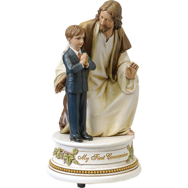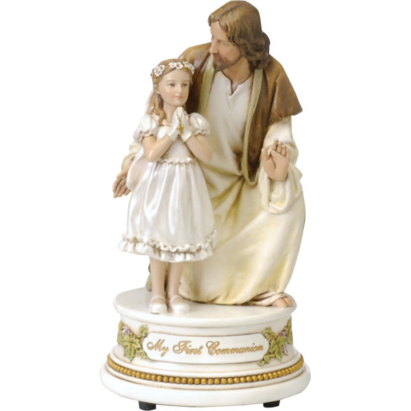 Boxed Reads "My First Communion" on base with grape motif on either side. This is a very nice figure of a young lady with Jesus kneeling beside her. Perfect as a gift on that special day of First Holy Communion.