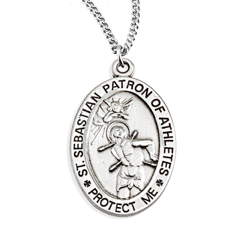 Patron Saint of endurance and athletes, Sebastian stands ready to intercede for those who need to persevere during the playing of sports. Front image shows St. Sebastian, with the back showing a boy playing soccer.
