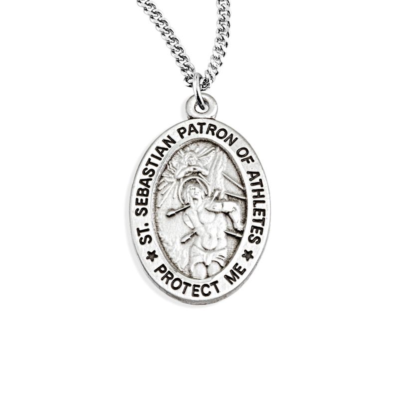 Patron Saint of endurance and athletes, Sebastian stands ready to intercede for those who need to persevere during the playing of sports. Front image shows St. Sebastian, with the back showing a girl playing volleyball.