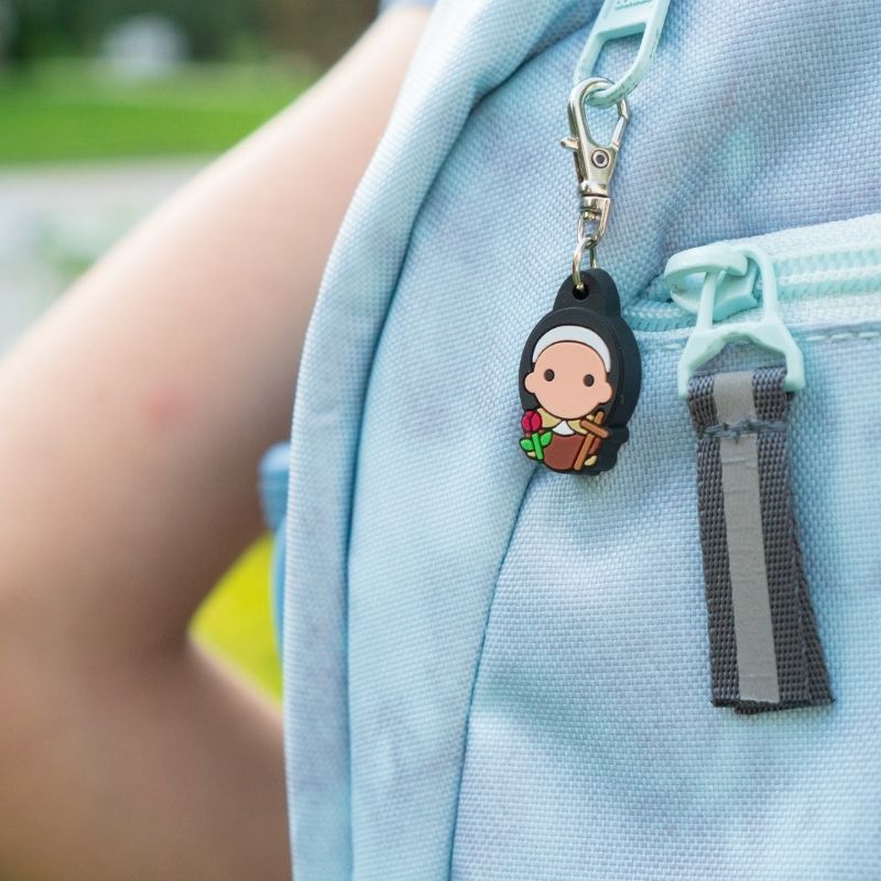 ST THERESE OF LISIEUX TINY SAINT CHARM Collect and exchange these little reminders of our church heroes. Like this one of St. Therese of Lisieux! Clip to backpack, keychain, purse or anything you can think of. Biography of saint included. Measures 1" and made of soft PVC with lobster clasp.
