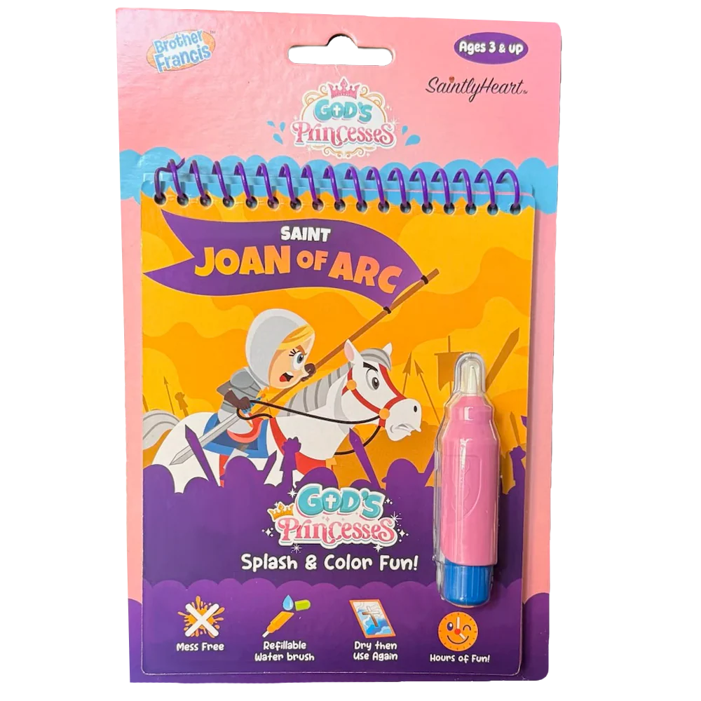 With the St. Joan of Arc Water Reveal Book, children can paint, play, and pray — all without the mess. Each water-activated page tells a moment from Joan’s brave story, revealing beautiful art and hidden faith symbols that disappear when dry.
