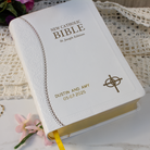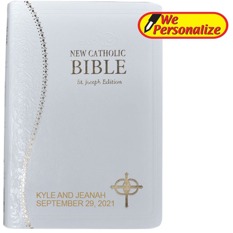 Introducing our Personalized Wedding Bible, a New Catholic Revised Version, that elegantly captures the profound significance of the Holy Sacrament of Matrimony. This bible is meticulously crafted with a richly embossed, white leather-like cover, featuring an intricate design that symbolizes the divine union of two souls. The elegant gold edges, a timeless touch of sophistication, make it even more appealing.