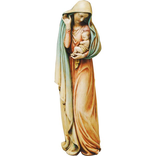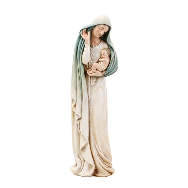 This gorgeous image of the Blessed Virgin Mary and the Child Jesus features a tender moment between mother and Son. Mary cradles the Infant Lord under her veil while she gazes at Him with wonder and love.
