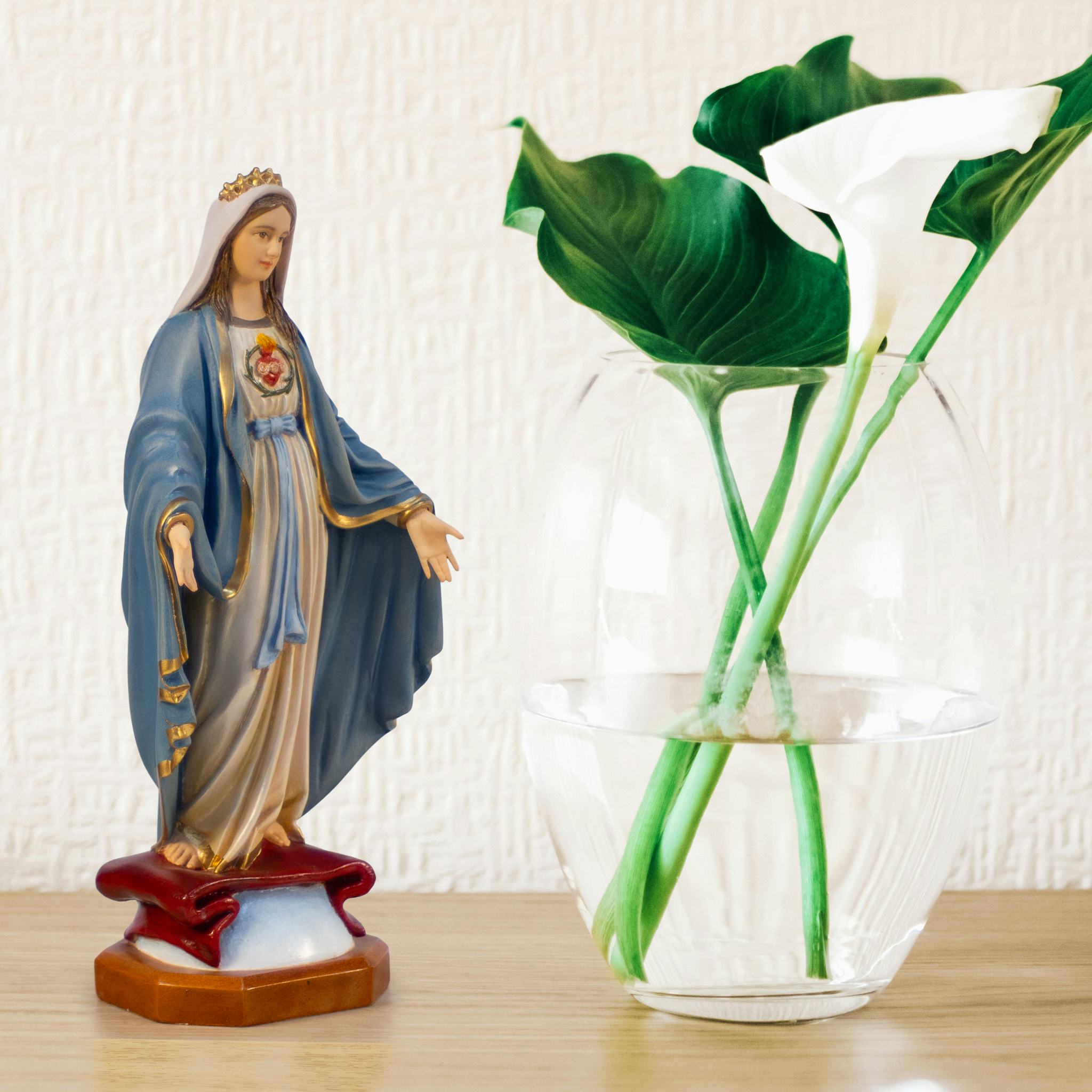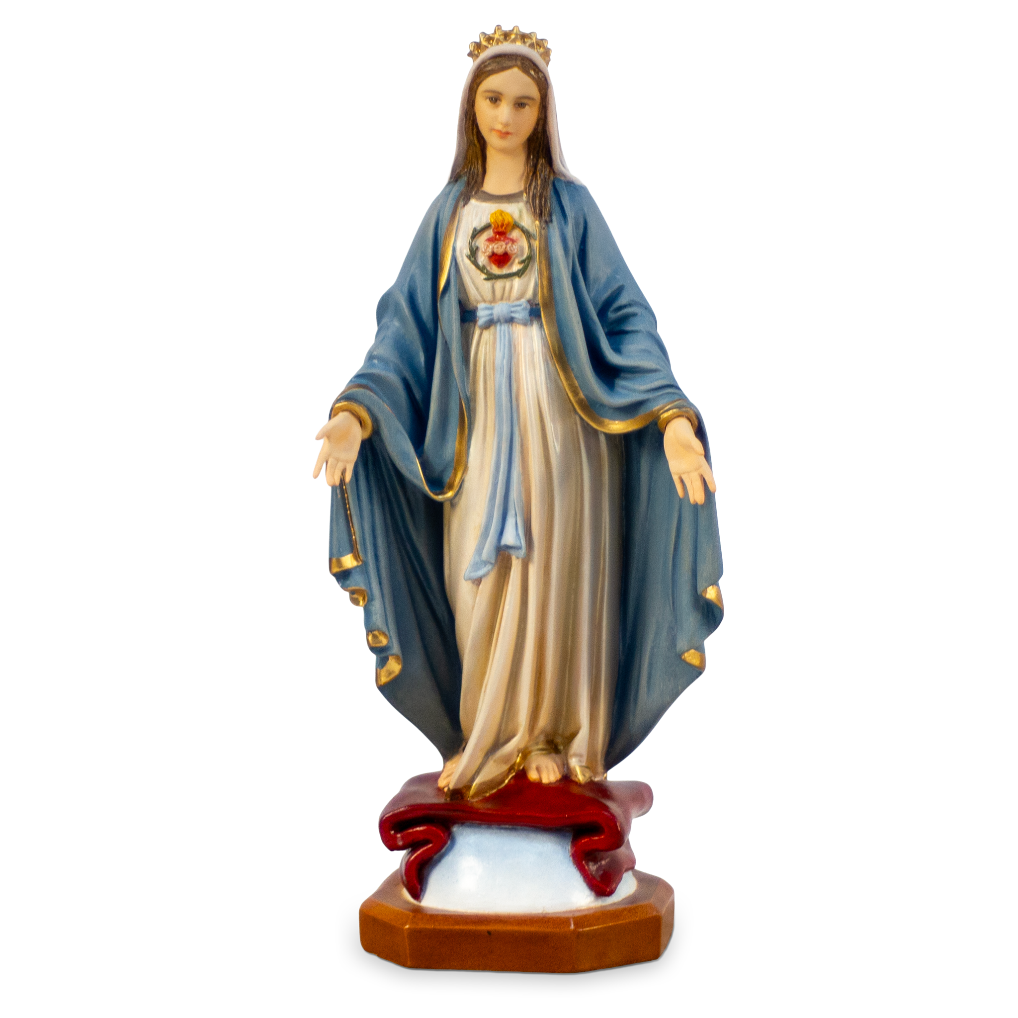 A unique image of the Immaculate Heart that features the Blessed Virgin standing on a red banner rather than a serpent. This symbolism is to highlight Our Lady crushing the errors and evils of Communism. A most needed image during these times in America and worldwide.