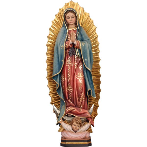Patroness of the Unborn, and Lady of the Americas, this image of the Blessed Virgin Mary celebrates how she appeared to St. Juan Diego; as the Woman clothed with the sun, with the moon under her feet. An angel supports to Queen of Angels, and unique to this image is her belt, showing that she is will child.